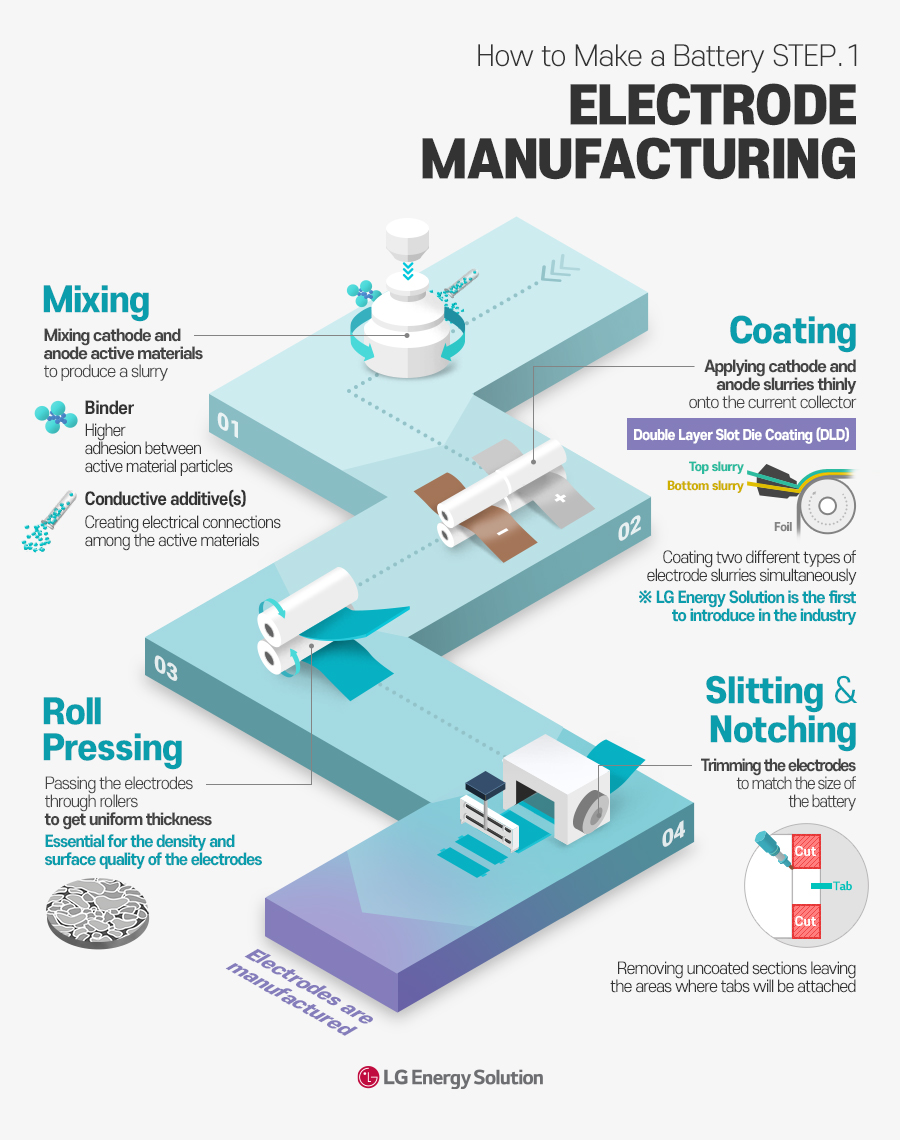 The electrode manufacturing process is about making the cathode and anode, the bases of batteries. It consists of mixing, coating, roll pressing, and slitting & notching, in that order. In the first step of the process, mixing, ingredients for making the cathode and anode are measured and mixed to produce slurries.