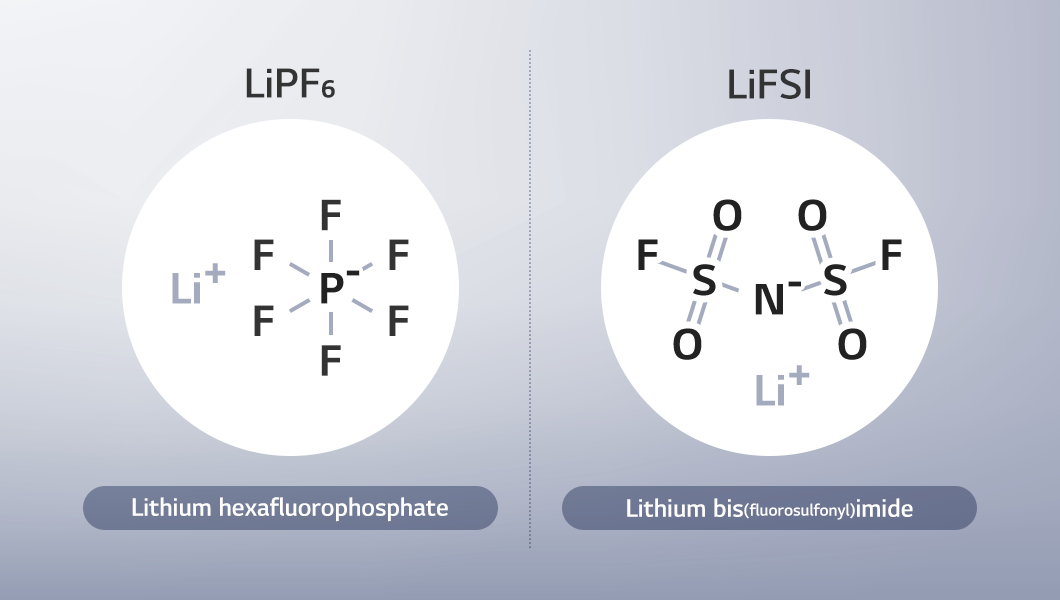 ■ LiFSI (Lithium bis(fluorosulfonyl)imide): A lithium salt composed of lithium ions (cations) and bis(fluorosulfonyl)imide (FSI-, anions). LiFSI is considered a strong alternative to the widely used LiPF₆, as it offers higher ionic conductivity and stronger chemical stability, and remains stable in humid and high-temperature environments. It is also referred to as F electrolyte, because it contains fluorine.