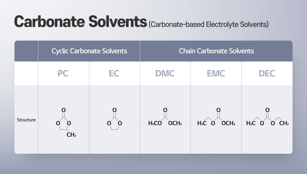 Organic solvents can be categorized into high-dielectric constant, high-viscosity cyclic carbonates and low-dielectric constant, low-viscosity chain carbonates (e.g., DEC, EMC, DMC). Cyclic carbonates can effectively dissolve lithium salts with their high dielectric constant, allowing cations and anions to separate easily. However, their high viscosity can slow down the movement of lithium ions. To address this issue, low-viscosity chain carbonates (or linear carbonates) such as DEC, EMC, or DMC are blended in.